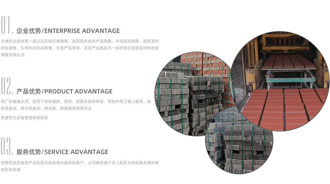 天津旺達(dá)建材是一家以沙子,水泥,加氣塊,加氣磚,面包磚,石灰和石膏銷(xiāo)售;建筑防水卷材產(chǎn)品銷(xiāo)售;建筑裝飾材料銷(xiāo)售;石棉水泥制品銷(xiāo)售;五金產(chǎn)品零售;五金產(chǎn)品批發(fā)為一體的綜合建筑型材料批發(fā)銷(xiāo)售有限公司,公司秉承客戶(hù)至上服務(wù)為根的基本原則期待您的蒞臨。作為專(zhuān)頁(yè)的建材生產(chǎn)企業(yè),我們?yōu)槟峁﹥?yōu)良的天津沙子、天津水泥和天津面包磚,肯定能滿(mǎn)足您對(duì)建筑材料的需求。我們天津沙子廠(chǎng)家的沙子粒度均勻,適用于各類(lèi)建筑項(xiàng)目,從住宅到大型商業(yè)工程,都能確保工程質(zhì)量的堅(jiān)固與耐用。我們天津水泥廠(chǎng)家生產(chǎn)的高強(qiáng)度水泥,經(jīng)過(guò)嚴(yán)格的質(zhì)量控制,不僅具備很強(qiáng)的粘合力,還擁有優(yōu)異的耐久性,能夠適應(yīng)各種復(fù)雜的施工環(huán)境,保障建筑結(jié)構(gòu)的穩(wěn)固。我們天津面包磚廠(chǎng)家生產(chǎn)的面包磚系列更是以其美觀(guān)、環(huán)保、耐磨的特性,廣泛應(yīng)用于城市道路鋪設(shè)、園林景觀(guān)建設(shè)等項(xiàng)目,提供持久的美觀(guān)與功能性。我們堅(jiān)持綠色環(huán)保理念,所有產(chǎn)品均通過(guò)嚴(yán)格的環(huán)保檢測(cè),力求為您提供相對(duì)高...